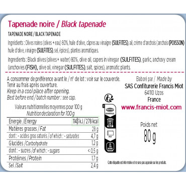 La tapenade aux olives noires est un savoureux mariage entre des olives noires, de la crème d’anchois et des câpres. Elle est idéale sur un toast à l'apéritif ou avec des crudités. Sur un buffet froid, elle créé un mélange parfait avec des bâtonnets de carottes, céleri et concombres. En cuisine, elle peut être utilisée pour badigeonner une viande, comme dans la recette du lapin à la tapenade. Notre + : nous avons choisi garder des morceaux d’olives qui donnent une texture et un goût unique