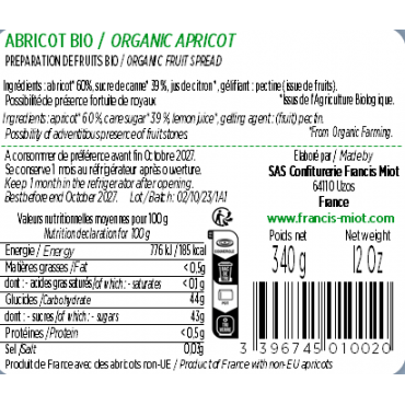 Abricot* 68 %, sucre de canne* 30 %, jus de citron*, gélifiant : pectine (issue de fruits).