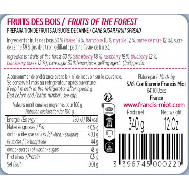 Fruits 60 % (fraise 18%, framboise 18%, myrtille 12%, mûre 12%), sucre de canne 39 %, jus de citron concentré, gélifiant : pectine (issue de fruits).