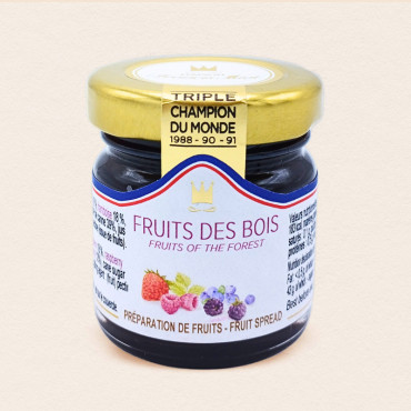 Notre boutique de vente en ligne a le plaisir de vous faire découvrir cette confiture artisanale Fruits des Bois au sucre de canne, disponible en pot de 340g et 45g.