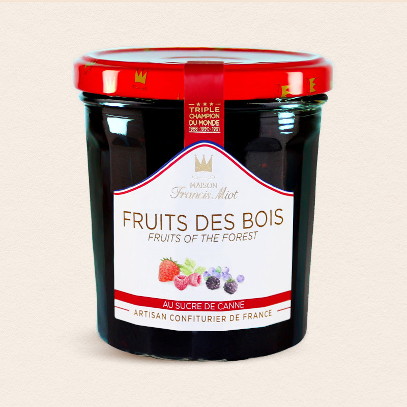 Laissez-vous voyager par notre confiture au sucre de canne aux Fruits des Bois artisanale, aux notes acidulées de nos fruits rouges.