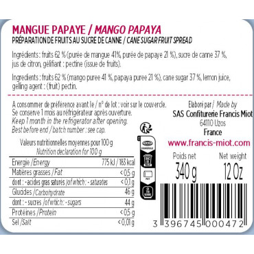Fruits 62 % (mague 41%, papaye 21%), sucre de canne 37 %, jus de citron concentré, extrait naturel de vanille, gélifiant : pectine (issue de fruits).