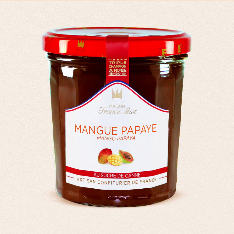Association exotique qui transporte instantanément la table du petit-déjeuner sous les climats tropicaux. La Maison Francis Miot propose un mélange de fruits moderne et gourmand, sublimé par un savoir-faire unique. Une douce confiture où la fraîcheur rencontre l’exotisme dans une alliance inédite de la mangue aux saveurs légèrement sucrées à la subtilité suave de la papaye.