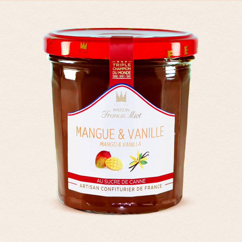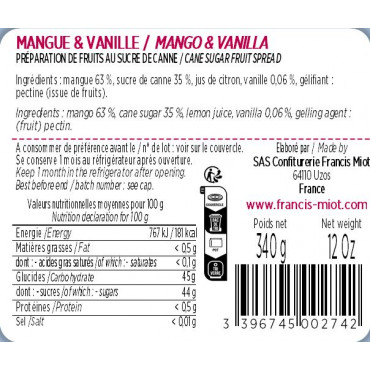 Mangue 63 %, sucre de canne 35 %, jus de citron, vanille 0,03 %, gélifiant : pectine (issue de fruits).