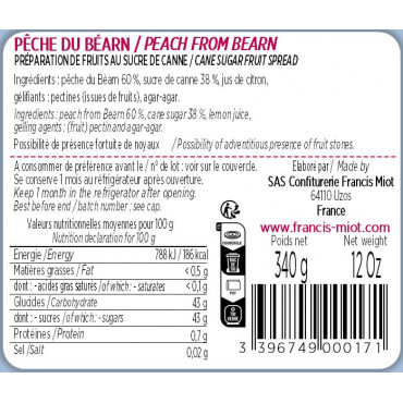 Pêche du Béarn 60 %, sucre de canne 39 %, jus de citron concentré, extrait naturel de vanille, gélifiants : pectine (issue de fruits) et agar-agar.