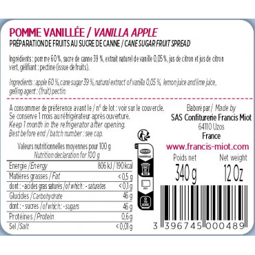 Pomme 60 %, sucre de canne 39 %, extrait naturel de vanille 0,06 %, jus de citron concentré et jus de citron vert, gélifiant : pectine (issue de fruits).
