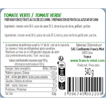Tomate verte 57 %, sucre de canne 34 %, citron et jus de citron, extrait naturel de vanille, gélifiant : pectine (issue de fruits).