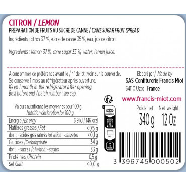 Notre boutique de vente en ligne a le plaisir de vous faire découvrir cette confiture artisanale Citron au sucre de canne disponible en pot de 340g.