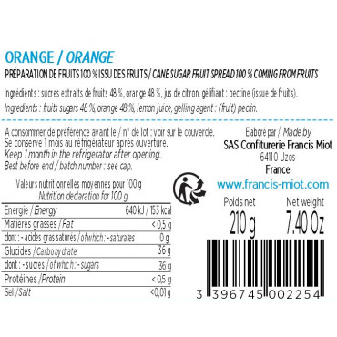 Orange 48 %, sucres extraits de fruits 48 %, jus de citron, gélifiant : pectine (issue de fruits).