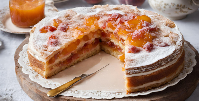 Nous vous proposons une recette de gâteau moelleux à la préparation de fruits de pêche à la rose.