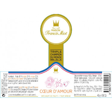 Fruits 60 % (abricot 32% et 29% pour le pot de 45g, purée de mangue 11% et 13% pour le pot de 45g, pêche 6 %, jus de fruits de la passion 11% et 12% pour le pot de 45g), sucre de canne 40 % et 39% pour le pot de 45g, Champagne 0,44 % et 0.5% pour le pot de 45g (sulfites), jus de citron, gélifiant : pectine (issue de fruits).