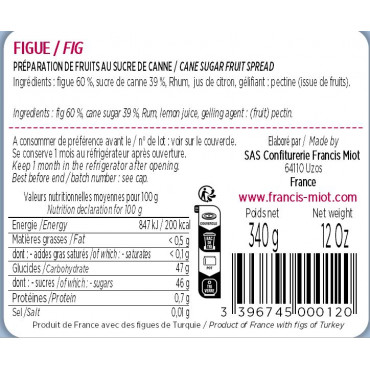 Figue 60 %, sucre de canne 39 %, Rhum, jus de citron, gélifiant : pectine (issue de fruits).