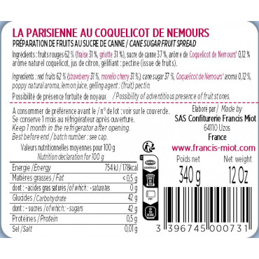 Fruits rouges 62 % (fraise 31%, griotte 31%), sucre de canne 37 et 36% pour le pot de 45g, arôme de Coquelicot de Nemours®0,12 %, arôme naturel coquelicot, jus de citron, gélifiant : pectine (issue de fruits).