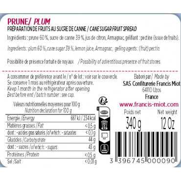 Prune 60 %, sucre de canne 39 %, jus de citron, Armagnac, gélifiant : pectine (issue de fruits).