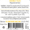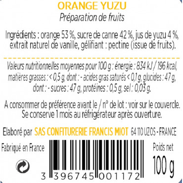 Orange 53 %, sucre de canne 40 %, jus de yuzu 4%, jus de citron, gélifiant : pectine (issue de fruits).