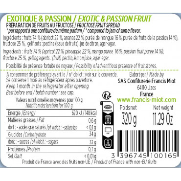 Fruits 74 % (abricot 22%, ananans 22%, mangue 16%, fruits de la passion 14%), fructose 25 %, jus de citron, gélifiants : pectine (issue de fruits) et agar-agar.