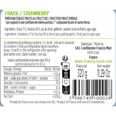 Elle réveille en nous des saveurs de l’enfance que l’on aime à retrouver dans cette préparation dont la teneur en sucre est réduite. La fraise, est le fruit rouge du plaisir par nature. Elle offre un goût acidulé et un parfum délicieux qui se prêtent parfaitement bien à l’élaboration d’une confiture. Fabriquée par nos Maîtres-Artisans Confituriers selon les procédés traditionnels de la Maison, cette authentique recette de préparation de fruits fraise saura embellir vos tartines et accompagner vos plus beaux desserts. Une préparation de fruits fraîche, très légère en sucre mais pas en saveurs qui fera à coup sûr l'unanimité autour de la tablée. Les fruits sont mijotés au fructose, préparés avec en moyenne 75g de fruits pour 100g.