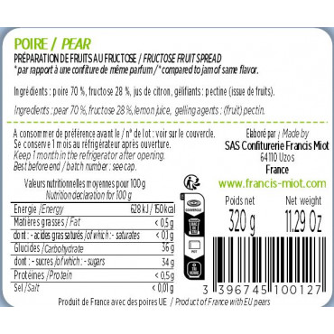 Poire 70 %, fructose 28 %, jus de citron, gélifiants : pectine (issue de fruits).