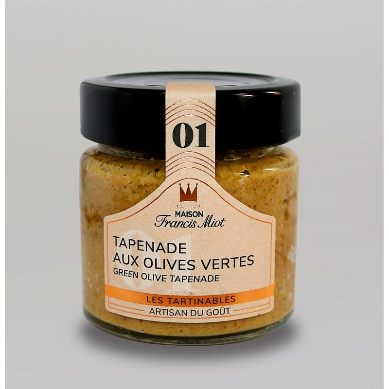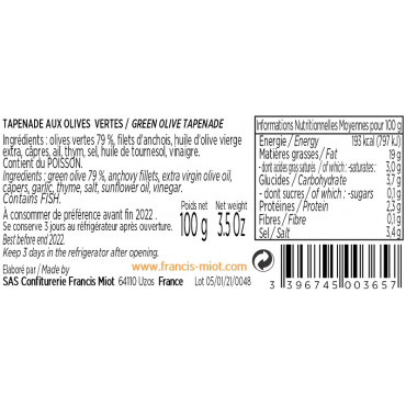 Ingrédients : Olives vertes 66%, huile d'olive, crème d'anchois (anchois (POISSON), huile d'olive, vinaigre SULFITES), (sel, épices), vin (SULFITES), câpres au vinaigre (SULFITES), sucre, ail, poivre, thym