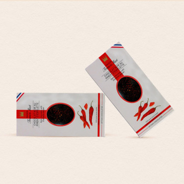 Chocolat noir Extra 99 % (masse de cacao, sucre, beurre de cacao, émulsifiant : lécithine de soja, arôme naturel de vanille), piment d'Espelette 1 %. Traces éventuelles de lait ou de produit à base de lait