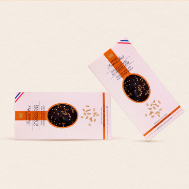 Son goût intense de blé noir se conjugue parfaitement à notre chocolat noir 100% pur beurre de cacao.