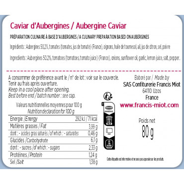 Ingrédients : Aubergines 50,2%, tomates (tomates, jus de tomate) (France), oignons, huile de tournesol, ail, jus de citron, sel, poivre