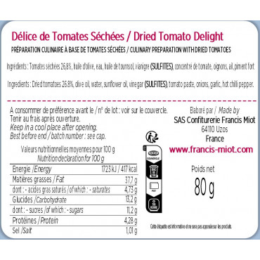 Ingrédients : Tomates séchées 26,8%, huile d'olive, eau, huile de tournesol, vinaigre (SULFITES), concentré de tomate, oignons, ail, piment fort.