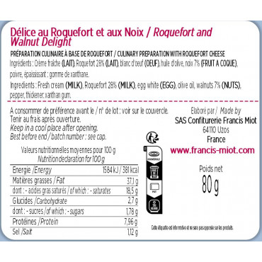 Ingrédients : Crème fraîche (LAIT), Roquefort 28% (LAIT), blanc d'oeuf (OEUF), huile d'olive, noix 7% (FRUIT A COQUE), poivre, épaississant : gomme de xanthane.